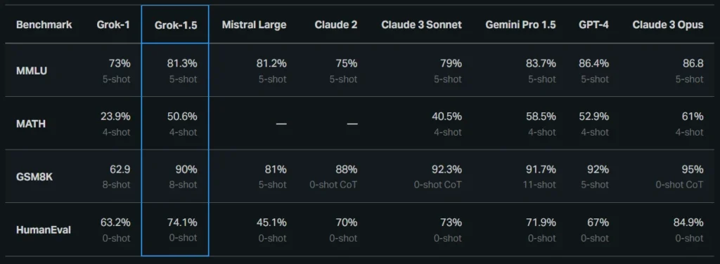 In rigorous testing scenarios, Grok-1.5 has demonstrated exceptional performance across various benchmarks - a testament to its advanced capabilities.